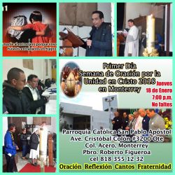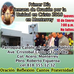 El jueves 18 de Enero en punto de las 7:00 pm dio comienzo la Semana de Oración por la Unidad en Cristo 2018, y en Nuevo León se llevó a cabo una Ceremonia de apertura en la Parroquia San Pablo Apóstol, de la Colonia Acero , perteneciente a la Arquidiócesis Católica de Monterrey. Estuvieron presentes[…]
