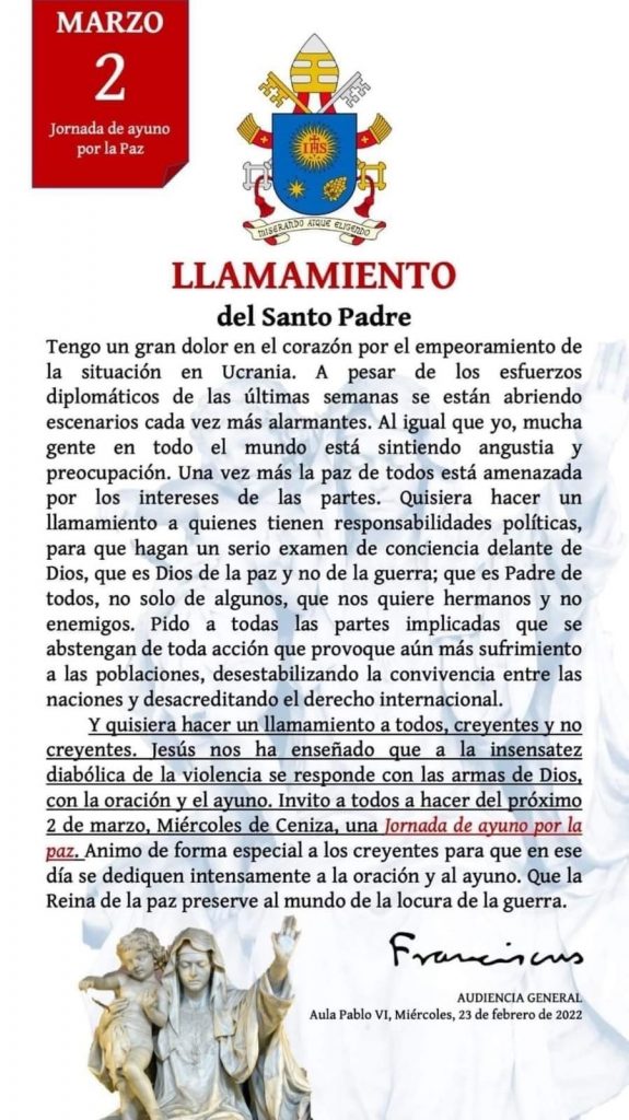 Llamamiento del Santo Padre Francisco por la situación de Ucrania Posted on 24 febrero, 2022 by María Isabel Miranda Silva.